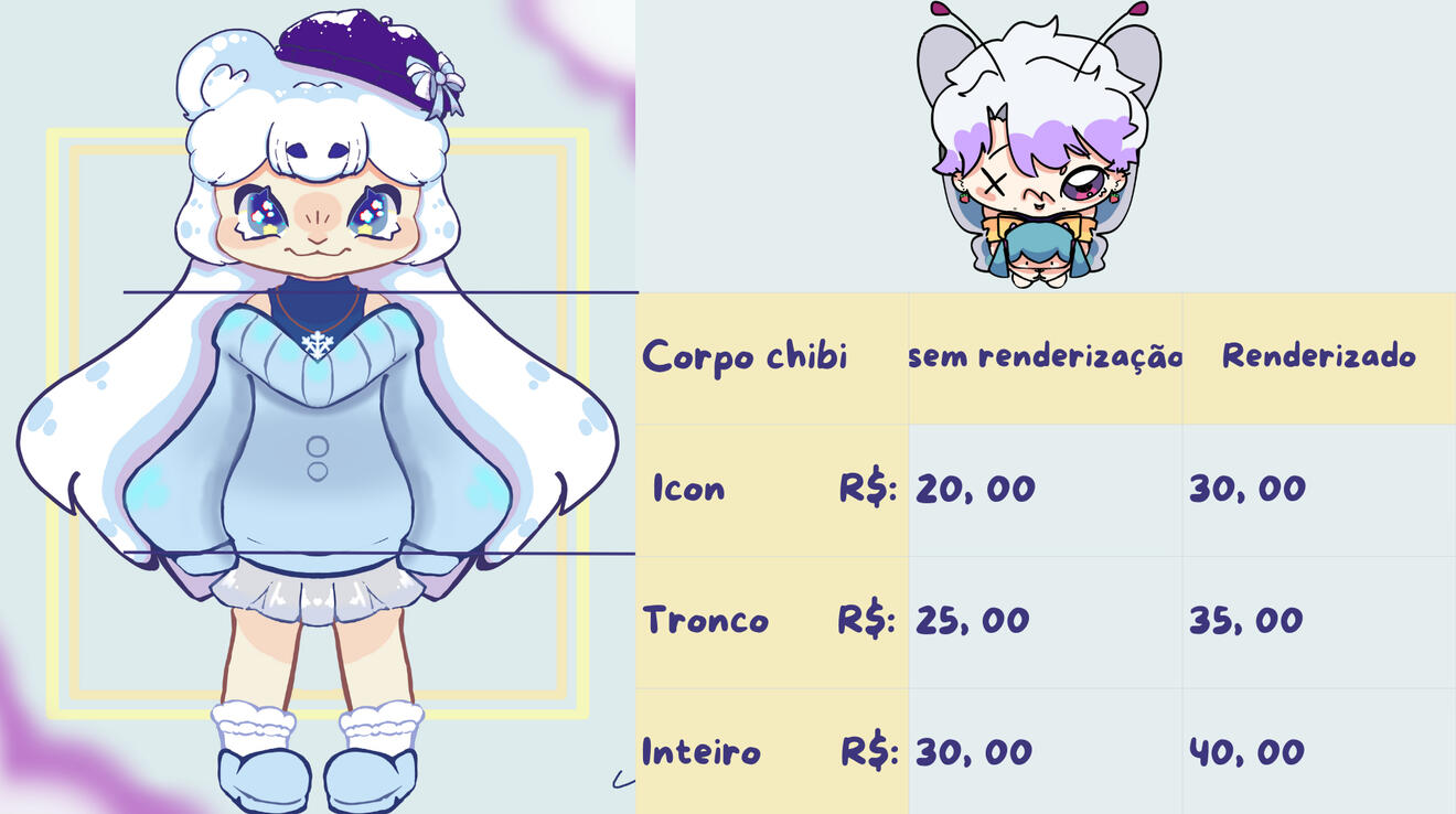 Mudanças poderão ser feitas no esboço, limitando se a três vezes de graça. Alterações extras serão cobradas, valor dependendo da complexidade. Caso o erro seja meu, não cobrarei pela mudança na arte. Após a Lineart, apenas cores base poderão ter uma única alteração sem custo.